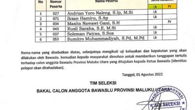 PENAMALUT.COM, TERNATE – Tim Seleksi (Timsel) Calon Anggota Bawaslu Maluku Utara akhirnya mengumumkan enam nama calon anggota Bawaslu yang lulus tes kesehatan dan wawancara.