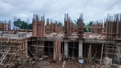 Terlihat sejumlah pekerja baru melakukan pengecoran lantai dua bagian depan gedung. Sementara di beberapa sudut lantai dasar masih ada rangka besi yang belum dilakukan pengecoran.