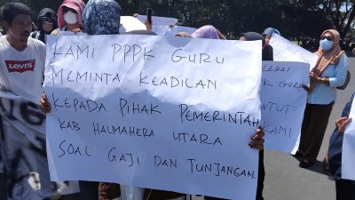 Aksi yang digelar puluhan guru ini dengan membawa poster dan spanduk bertuliskan “kami PPPK guru meminta keadilan kepada pihak Pemerintah Kabupaten Halmahera Utara soal gaji dan tunjangan”.
